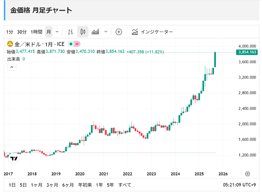 また、国際価格の指標となるニューヨーク先物(中心限月)でも、9月23日時点で1トロイオンス(約31.1グラム)が初めて3800ドル台に達しました。
