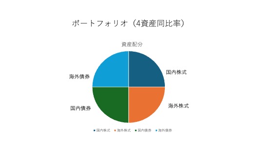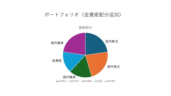 GPIF(年金積立金管理運用独立行政法人)の基本ポートフォリオをモデルにした国内株25%、海外株式25%、国内債券25%、海外債券25%の配分のうち、国内債券配分を18%に金の配分を17%に振りむけてみるのも一つの考えではないでしょうか。