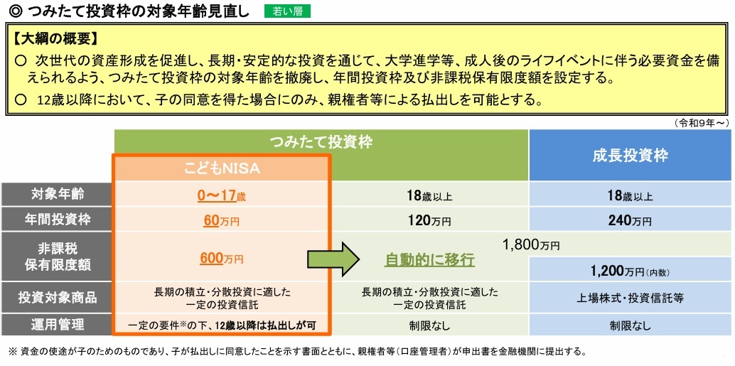 これが決まると0歳から成人になる17歳までは年間60万円までつみたて投資枠が設定され、その期間の非課税保有限度額は600万円となる見込みです。