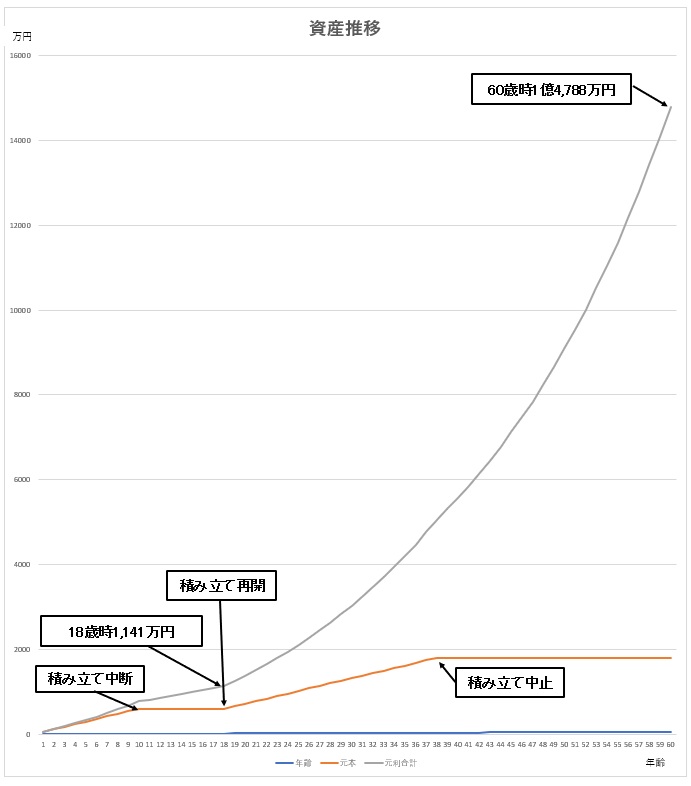 お金に余裕があり、子供へ贈与を毎年継続していけるという人にとっては、18歳から成長投資の枠として毎月5万円(60万円/年の積み立てを再開して生涯投資枠1,800万に達するまで20年間積み立てを行うと、38歳の時に累計投資額1,800万円となりますので、積み立ては中止し、運用のみ行い老後資金として活用しようとすると60歳のときにはなんと1億4,788万円という大きな数字になります。